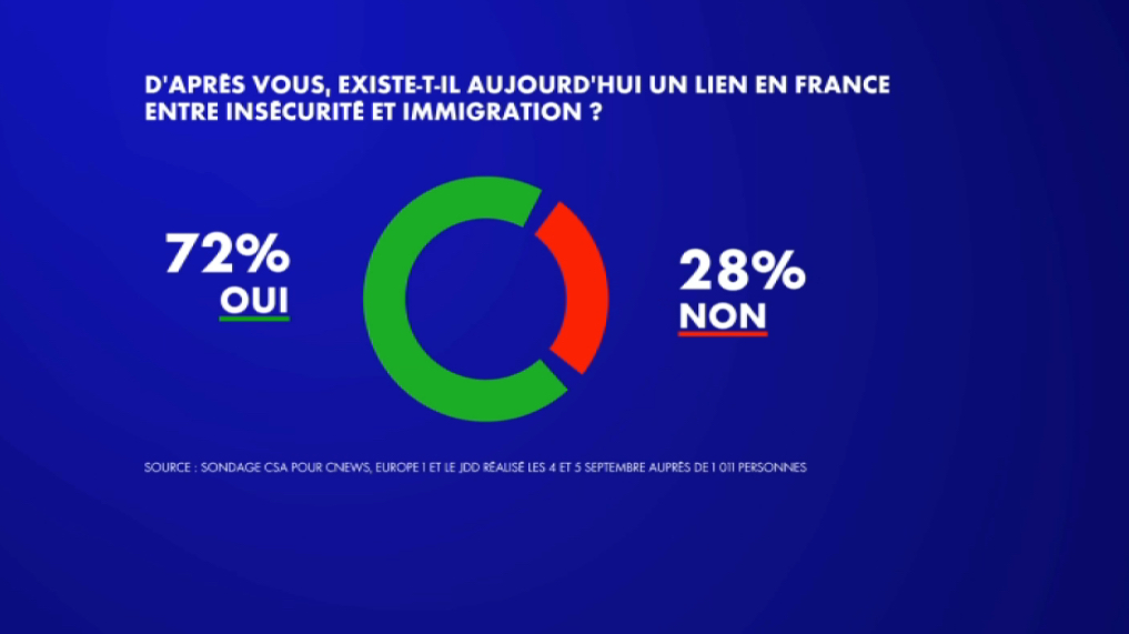 كشف استطلاع للرأي أنجزه معهد CSA لصالح CNEWS وEurope 1 وJDD أن 72% من الفرنسيين يرون وجود رابط بين انعدام الأمن والهجرة، في أعقاب الهجوم بالسكين الذي نفذه رجل تونسي الجنسية في مدينة مرسيليا مطلع الأسبوع. وتشكل هذه النسبة ارتفاعا طفيفا مقارنة بمايو 2024 حين بلغت 68%.